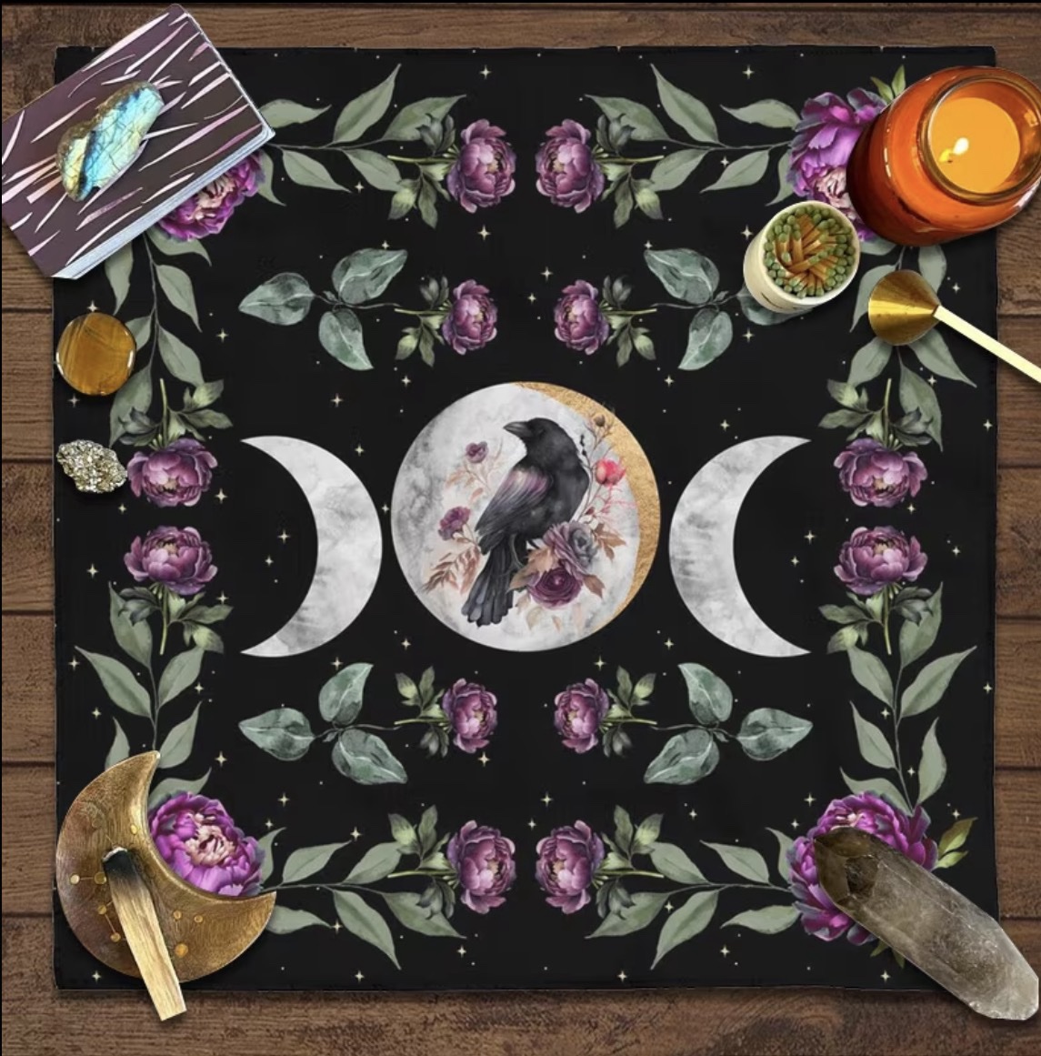 Denne smukke alterklud er dekoreret med månefaser, blomstrende roser og en sort ravn – et stærkt symbol på intuition, transformation og forbindelsen mellem verdener. Det mørke nattehimmel-motiv skaber en beskyttende og fokuseret ramme omkring dit alter og forstærker stemningen under ritualer, spell work og meditation.