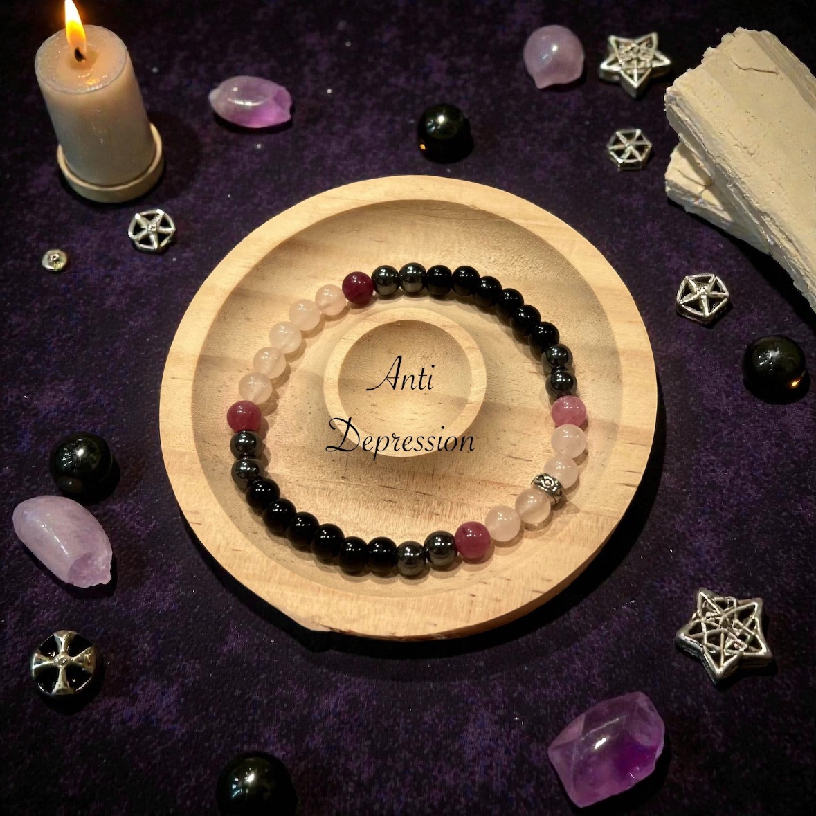 Find indre ro og balance med dette smukke anti-depressionsarmbånd, skabt med omhu og kraftfulde ædelsten: lepidolit, rosenkvarts, hematit og obsidian.