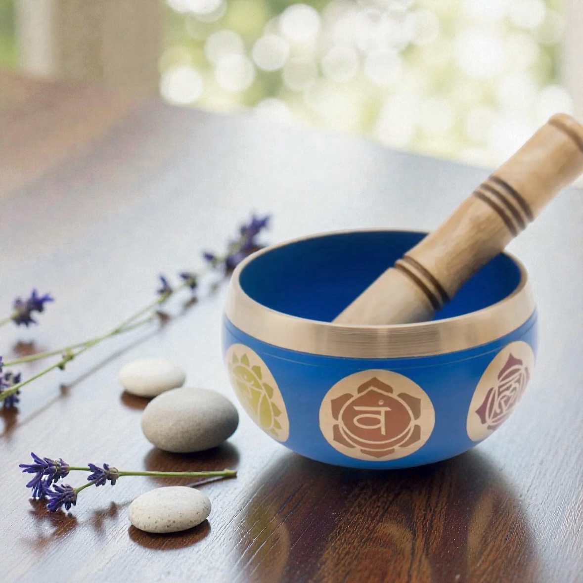 Bring harmoni og balance ind i dit liv med denne håndlavede syngeskål i dyb blå farve, udsmykket med chakra-symboler i gyldne nuancer.