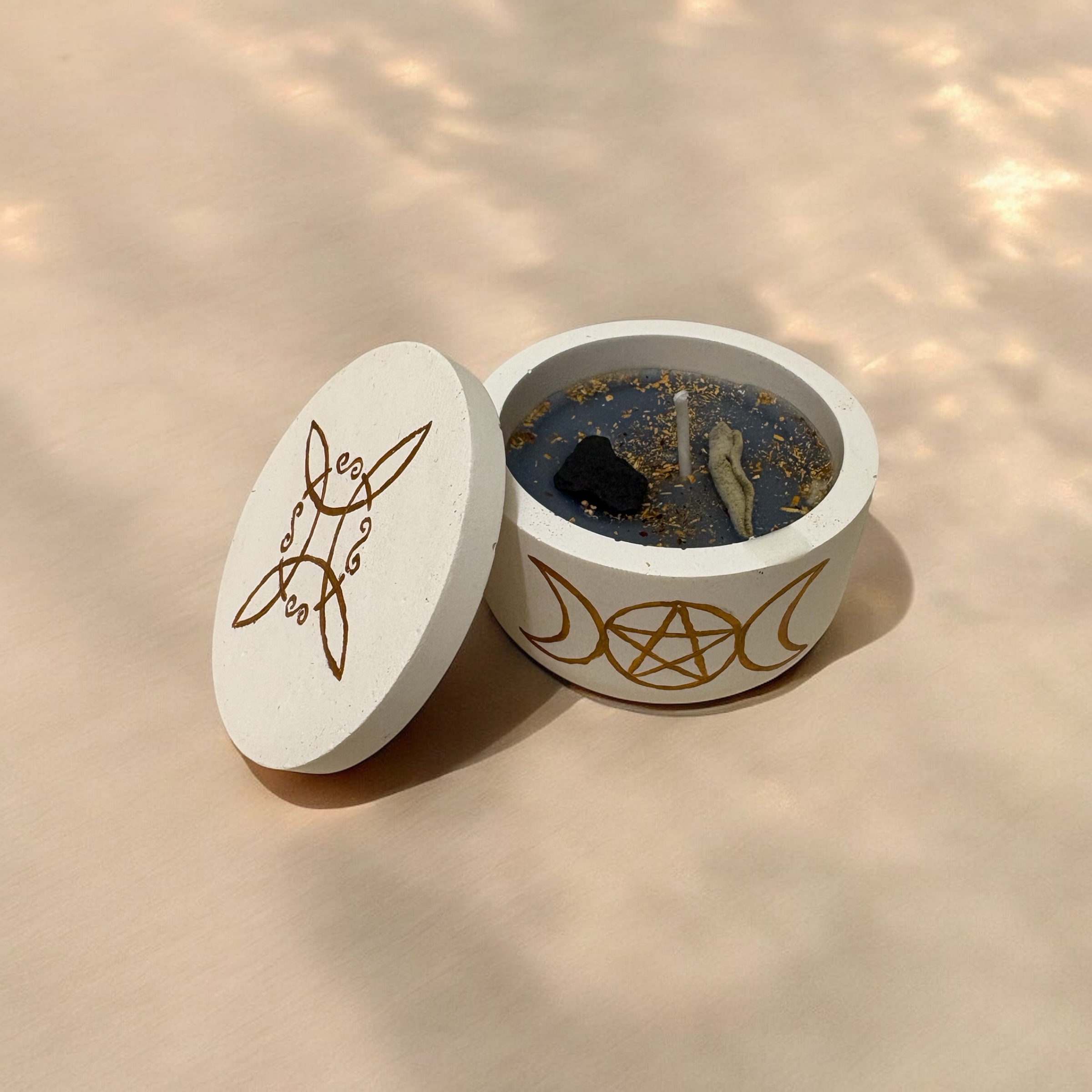 Lyset er håndlavet og indeholder en kraftfuld kombination af rensende urter og sten, der arbejder både spirituelt og energetisk.