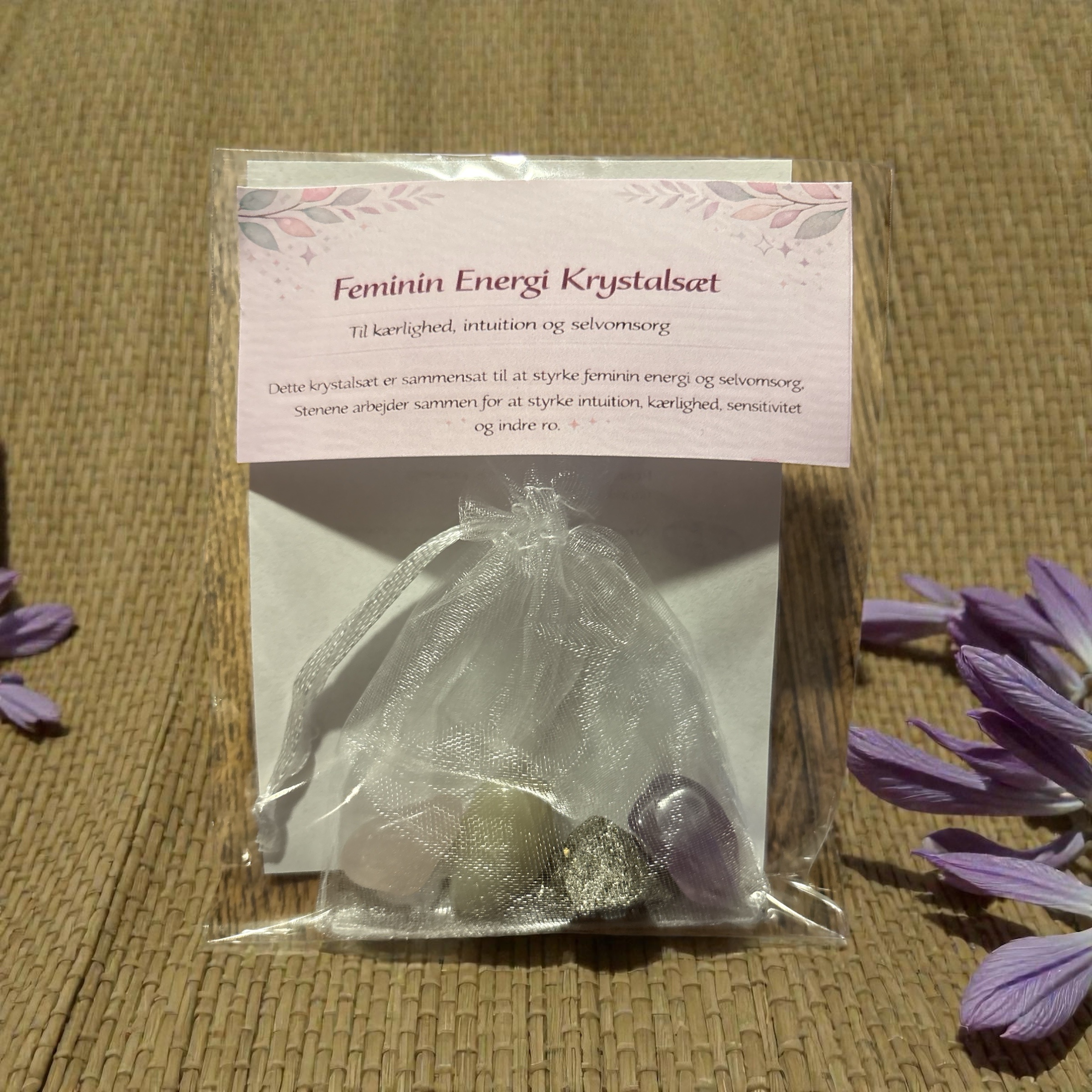 Dette Feminin Energi Krystalsæt er skabt til at støtte dig i at forbinde dig med din feminine energi, indre ro og intuitive kraft. Sættet arbejder blidt men dybt med selvomsorg, følelsesmæssig balance og hjertets visdom.
