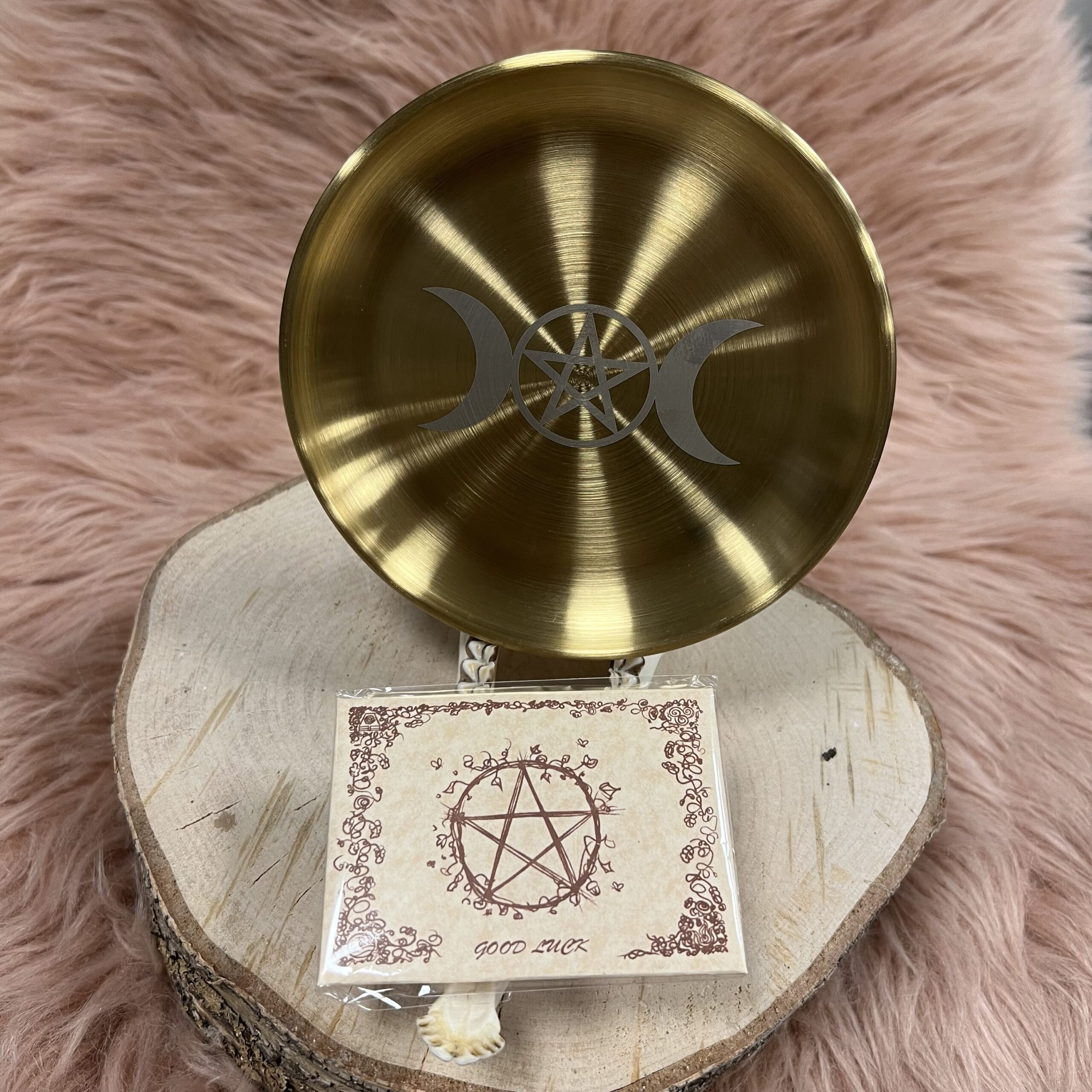 Tilføj en elegant og spirituel dimension til dine ritualer med denne guld ritualplade dekoreret med et smukt tribal moon-motiv. Pladen er designet til at være både praktisk og æstetisk, perfekt til brug under manifestationer, ceremonier og energiarbejde.