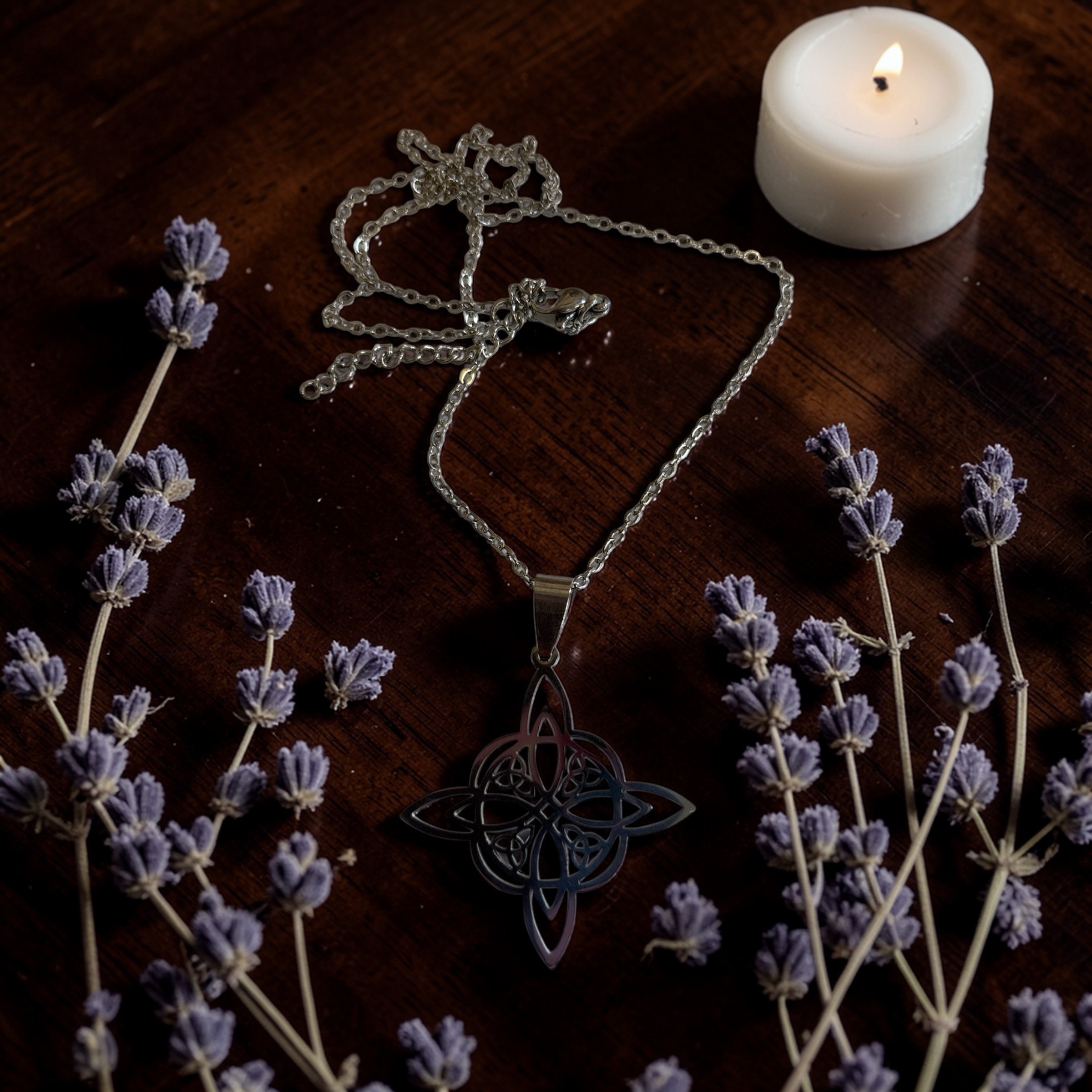 Mystisk og kraftfuld halskæde med et smukt hekseknude-symbol, kendt for sin beskyttende og forstærkende energi. De sammenflettede linjer skaber et evigt mønster, der arbejder med at holde negativ energi ude og styrke din egen kraft.