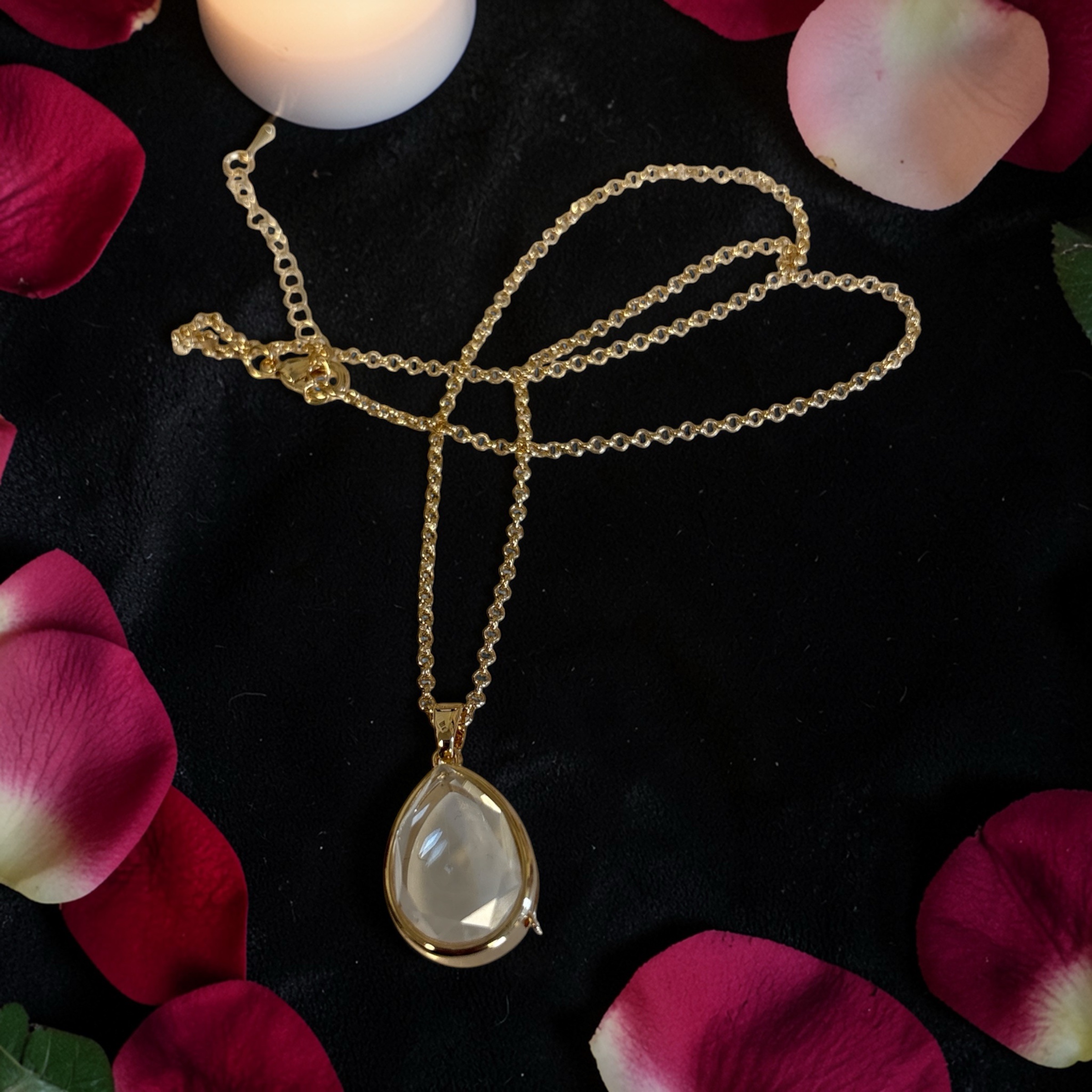 Den bløde, klare sten giver et mystisk og drømmende udtryk, mens det gyldne design tilfører varme og elegance. Perfekt til dig der arbejder med manifestation, kærlighed, beskyttelse eller energi.