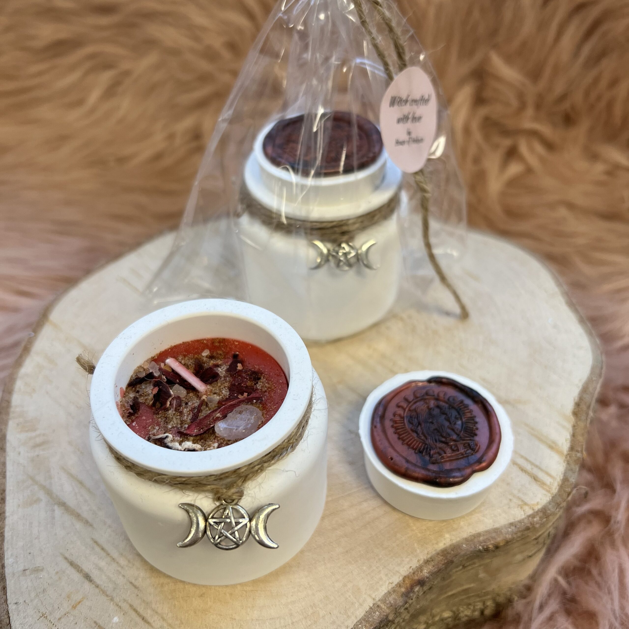 •Indlejrede Sten & Urter: Lysene er omhyggeligt indlejret med udvalgte krystaller og urter, som forstærker deres energi. Disse ingredienser er nøje udvalgt for deres spirituelle egenskaber, såsom beskyttelse, klarhed eller kærlighed.