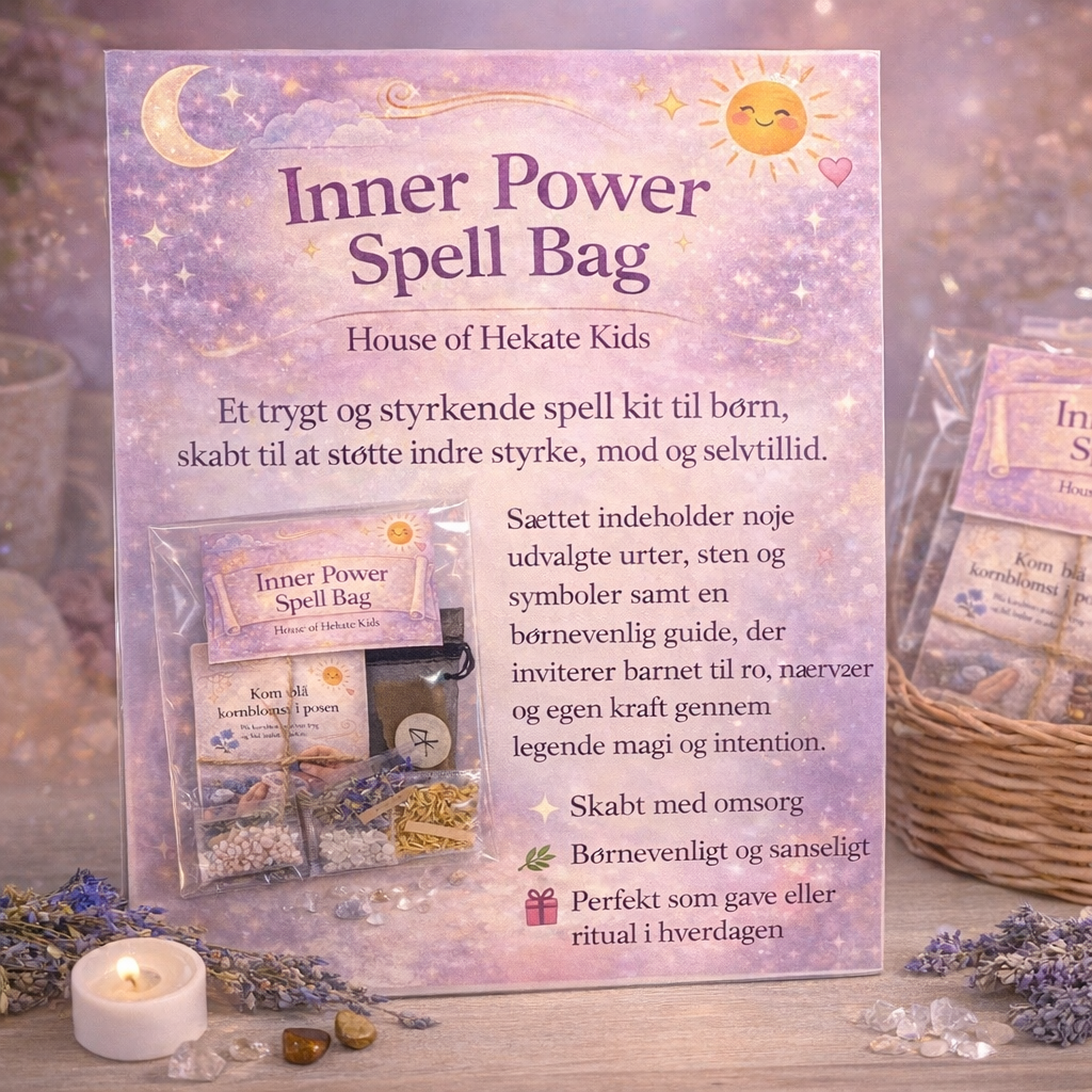 Spell bagen samles sammen med en voksen og fungerer som et symbol på barnets egne ressourcer og styrker. De udvalgte urter, sten og symboler forbindes med mod, stabilitet og personlig kraft — og hjælper barnet med at mærke: “Jeg kan godt.”