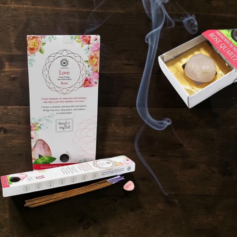 Skab en blid, romantisk og kærlig stemning med disse Love røgelsespinde med Rose, beriget med en smuk rosenkvarts.