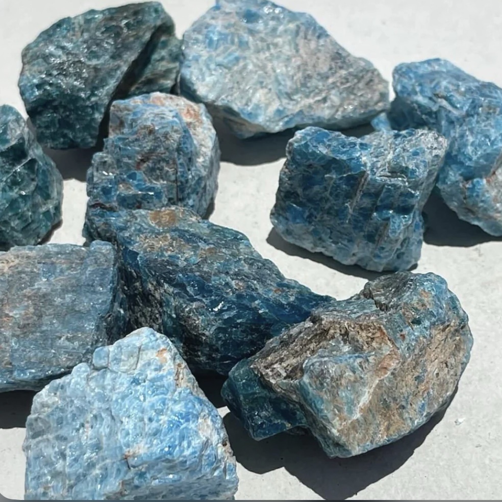Rå apatite er en smuk sten, der udstråler en livlig blå eller grøn farve, hvilket giver den et frisk og energisk udseende. Denne sten er kendt for sin evne til at fremme klarhed i sindet og åbne op for inspiration og kreativitet.