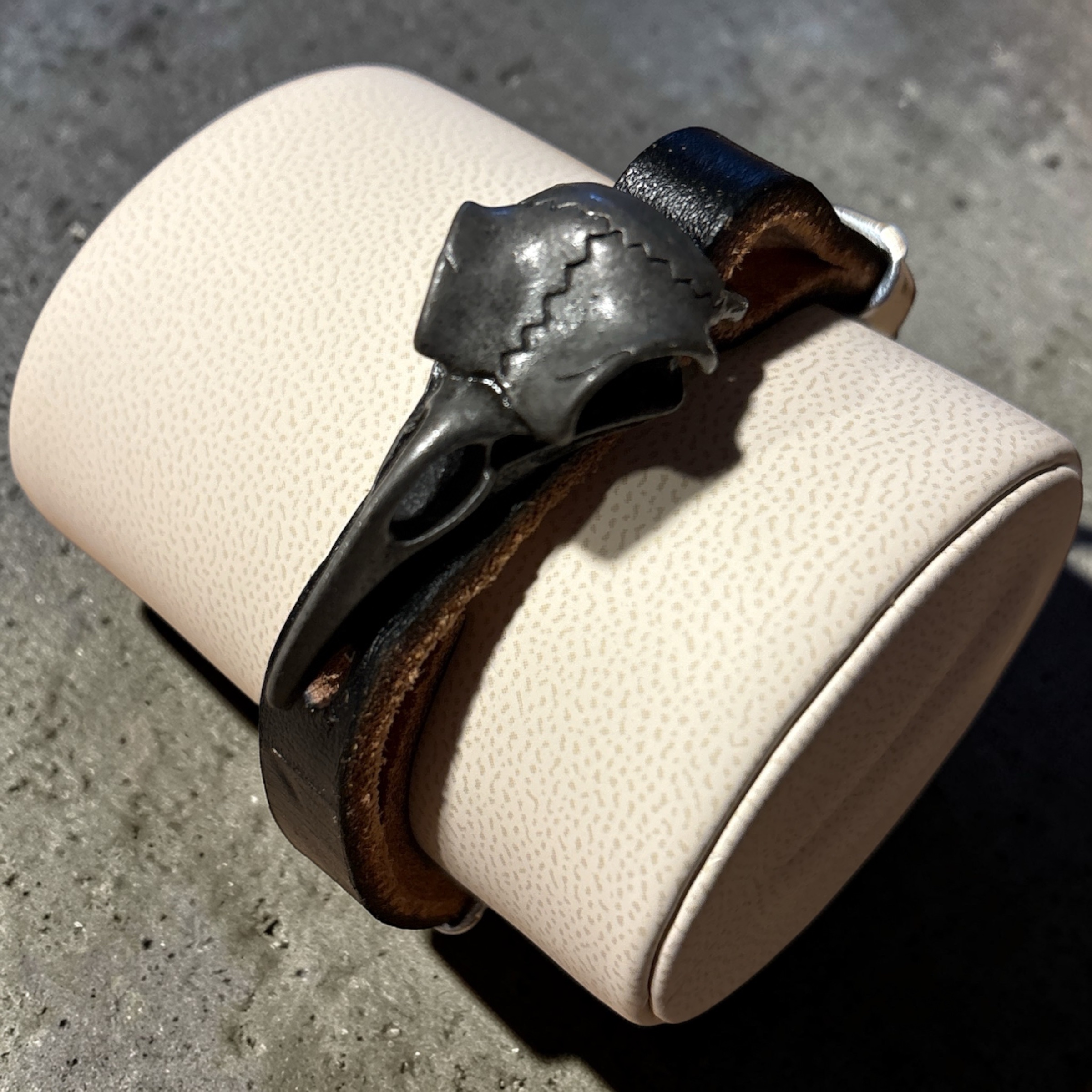 Et råt og kraftfuldt armbånd med et detaljeret ravnekranie – et symbol på visdom, transformation og forbindelse til det skjulte.
