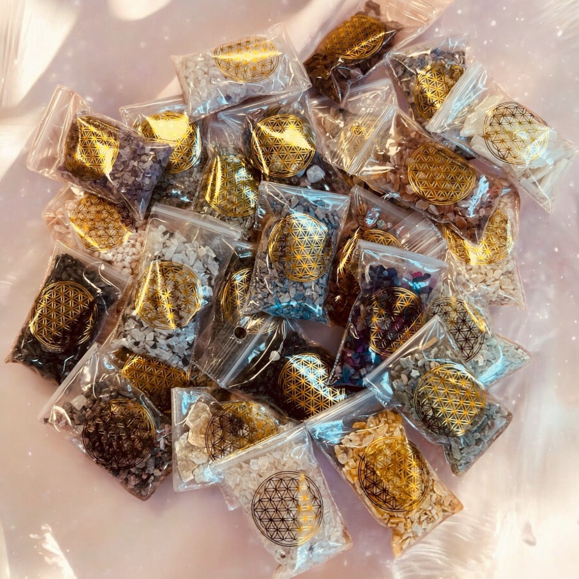 Sæt med 10 poser forskellige krystalchips til spell work – 6,5 x 4 cm pr. pose