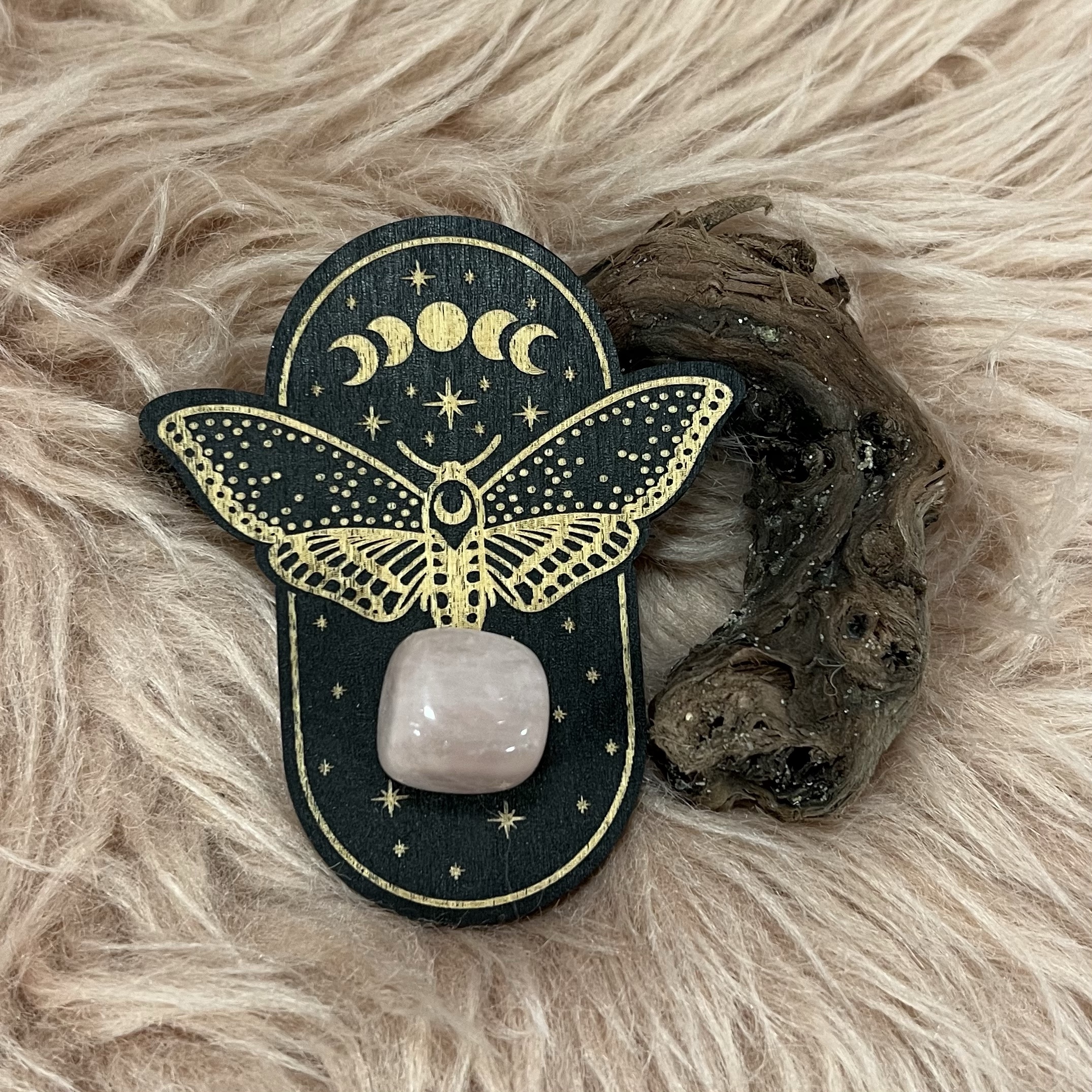 Tilføj en elegant og spirituel stemning til dit hjem med denne smukt designede træplade. Pladen er dekoreret med et unikt motiv af en møl og månefaser, som symboliserer transformation, intuition og balance. Den er udstyret med et hul i midten, perfekt til at placere en dekorativ sten, krystal eller anden genstand, der har betydning for dig.